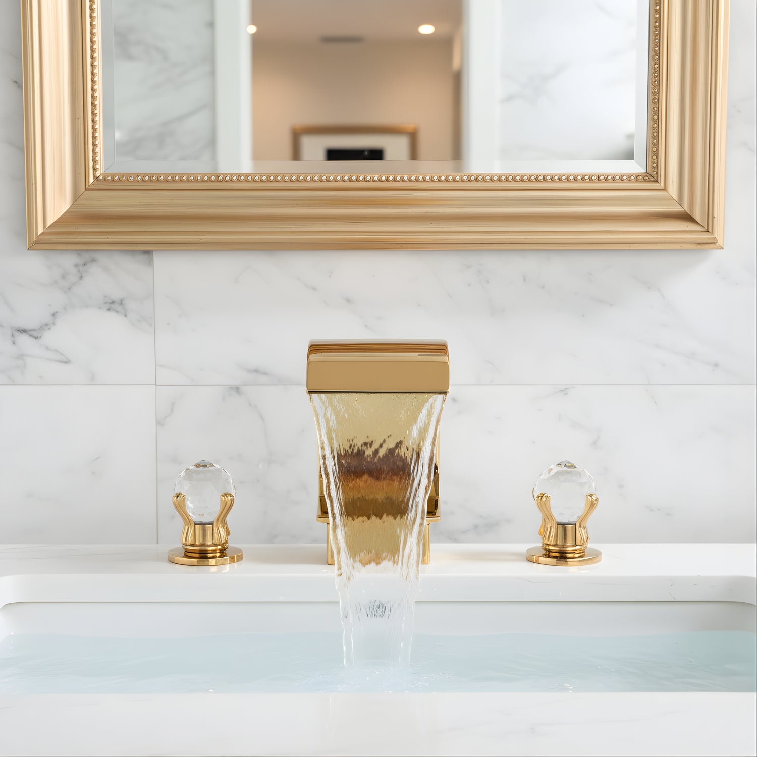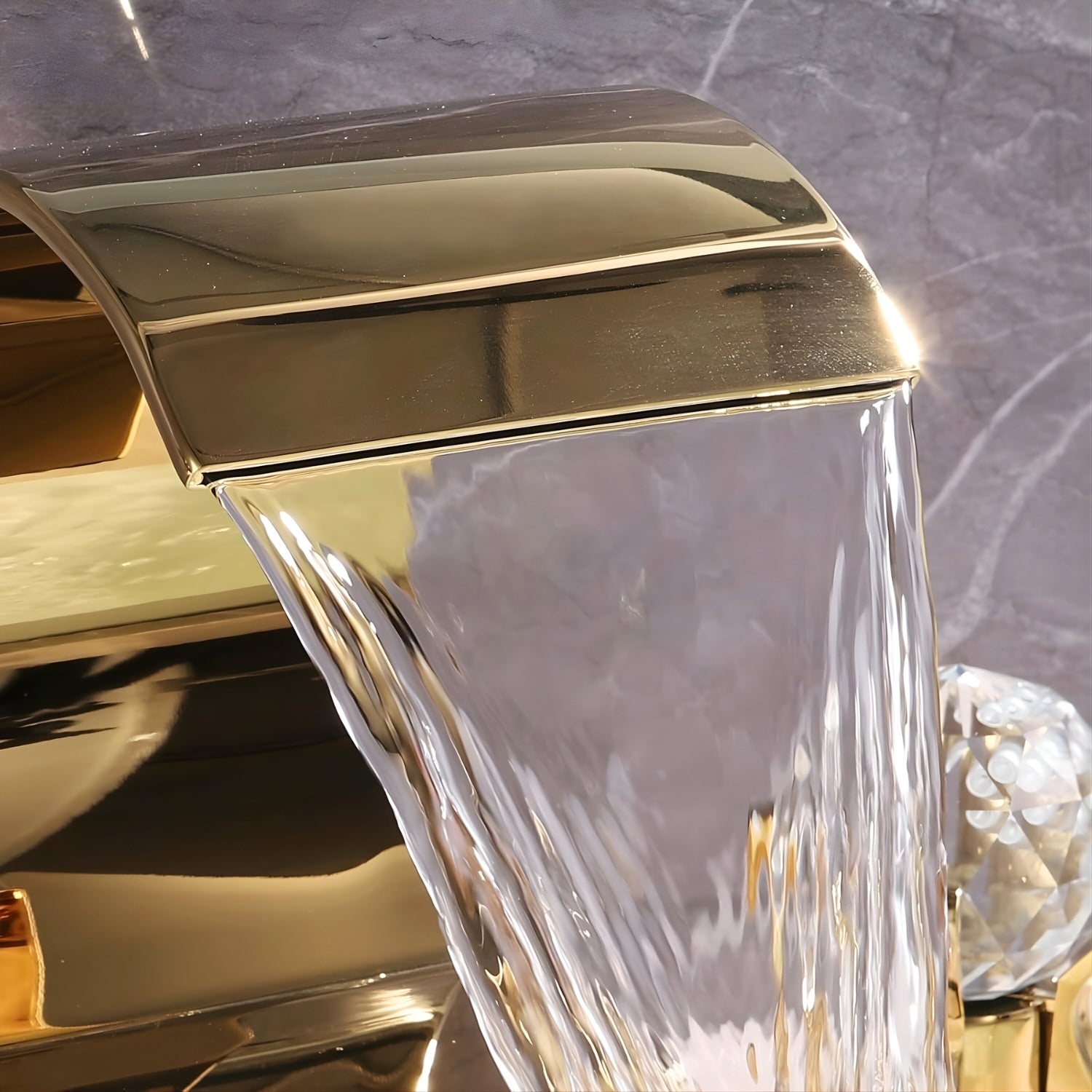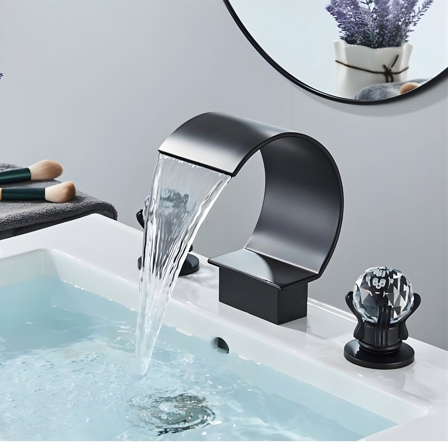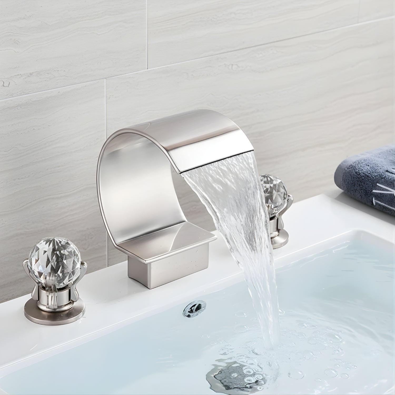 Bring sophistication and flow to your bathroom with the Halle - Three-Hole Waterfall Bathroom Faucet. Its gracefully curved spout delivers a smooth, cascading stream that mimics the serenity of a natural waterfall. Crafted from premium solid brass. Halle combines durability with timeless luxury. The crystal-style handles add a touch of elegance, making it a true statement piece for any modern or classic bathroom. Designed for three-hole installation, this faucet blends form and function, turning everyday moments into an indulgent experience.