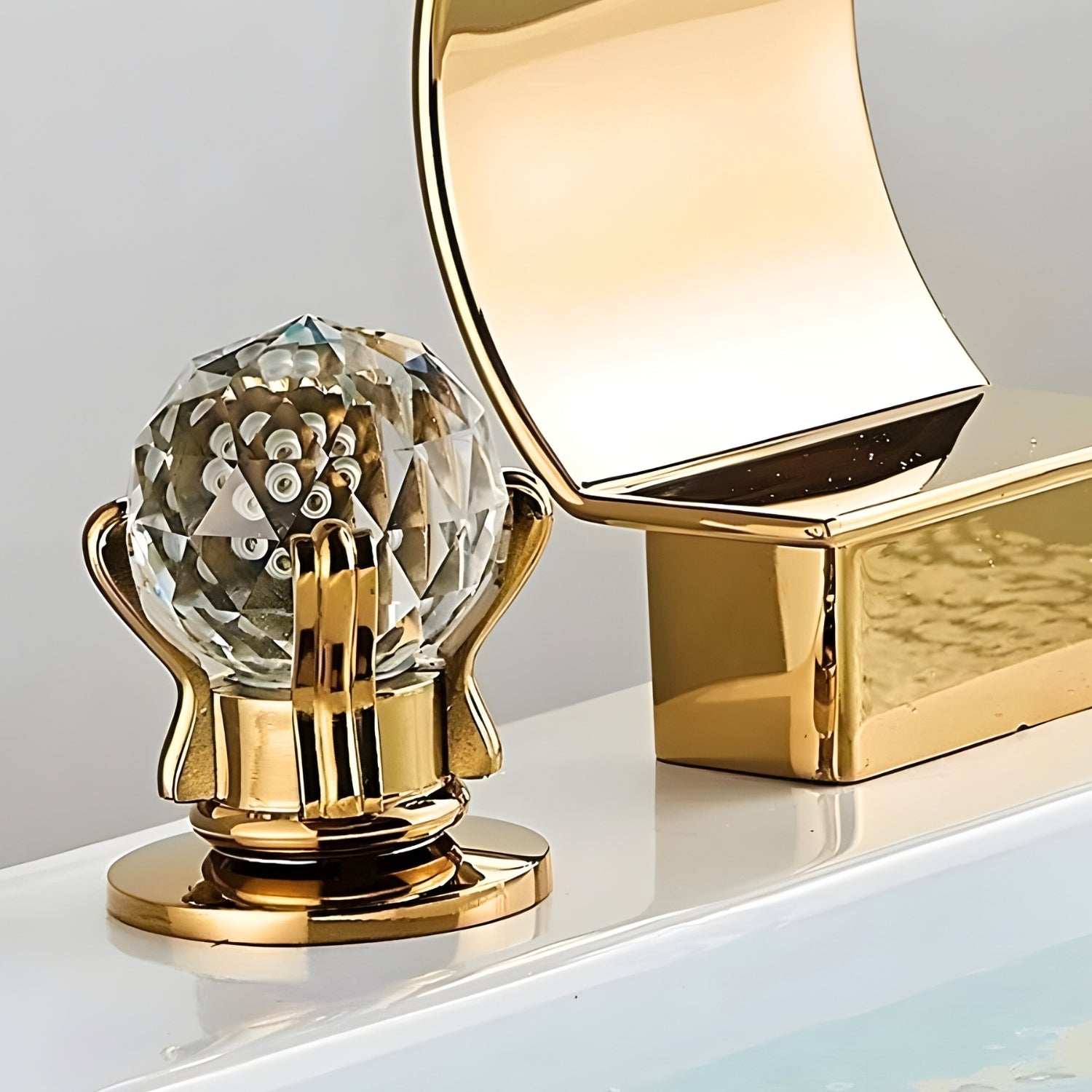 Bring sophistication and flow to your bathroom with the Halle - Three-Hole Waterfall Bathroom Faucet. Its gracefully curved spout delivers a smooth, cascading stream that mimics the serenity of a natural waterfall. Crafted from premium solid brass. Halle combines durability with timeless luxury. The crystal-style handles add a touch of elegance, making it a true statement piece for any modern or classic bathroom. Designed for three-hole installation, this faucet blends form and function, turning everyday moments into an indulgent experience.