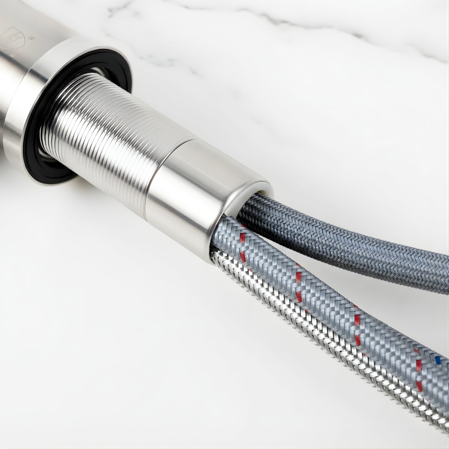 Experience complete control with Halmstad’s high-arc design and flexible spring hose. Its industrial-inspired style brings confidence and elegance to your kitchen routine