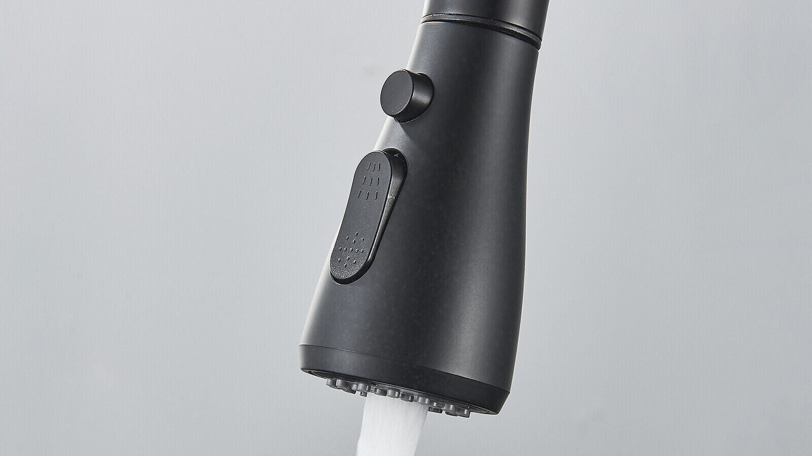 The Karlstad Modern Pulldown Kitchen Faucet combines a standard mixer and filtered water tap in one solid brass fixture. This 3-way kitchen faucet eliminates the need for a separate filter hole—keeping your countertop clean.