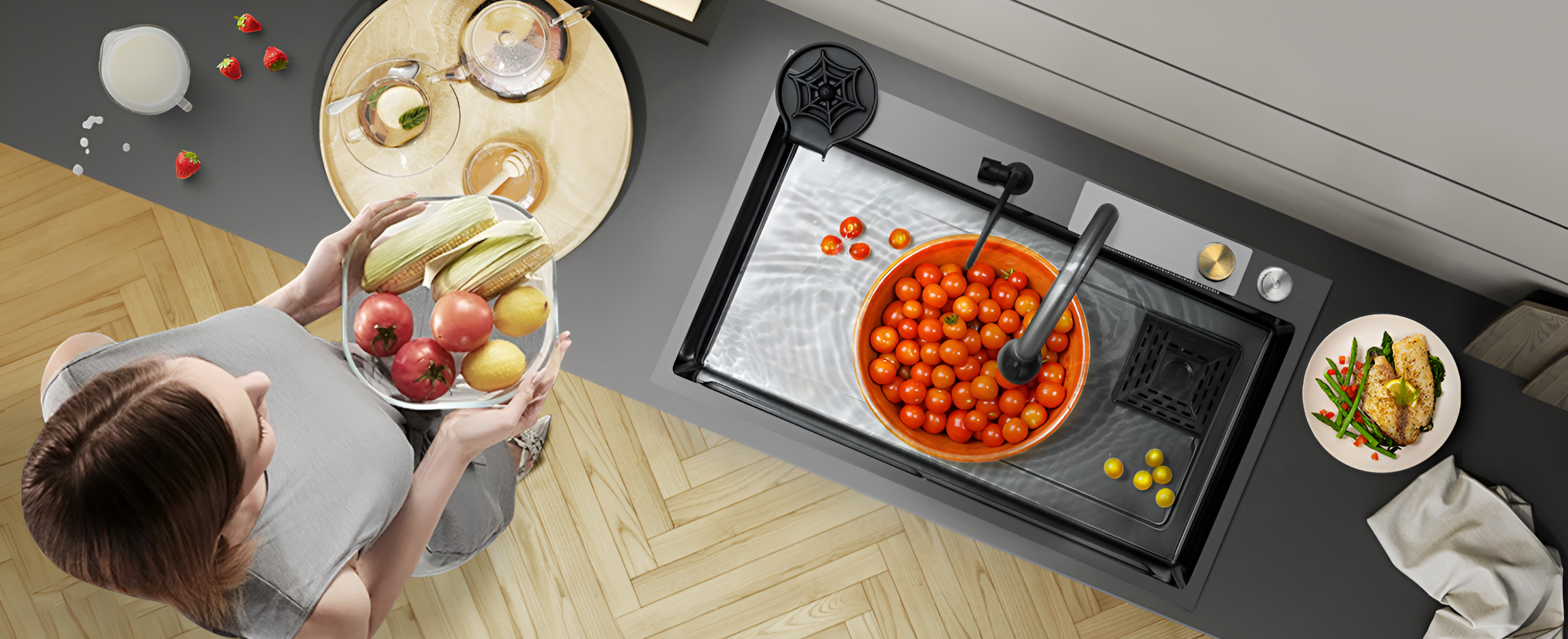 Our all-in-one workstation sink features a built-in waterfall, perfect for rinsing fruits, vegetables, and more.